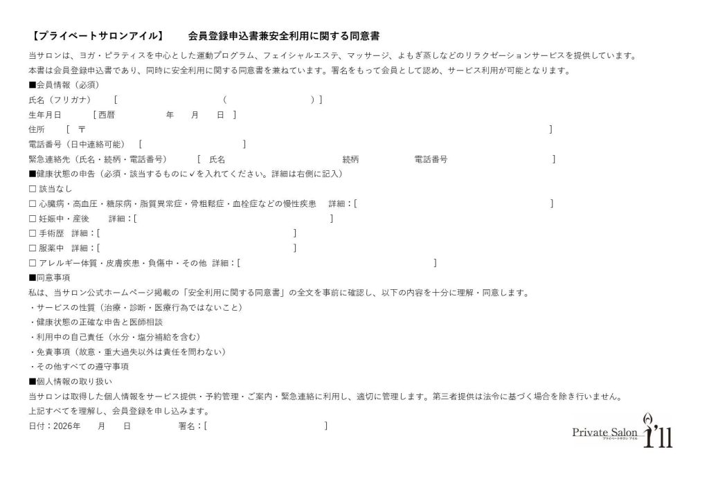 【プライベートサロンアイル】安全利用に関する同意書(健康申告書兼免責同意書)